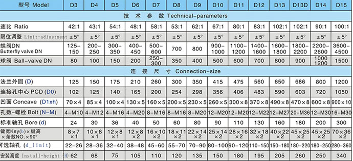 該產(chǎn)品是一種90°回轉(zhuǎn)型驅(qū)動(dòng)裝置,適用于球閥、蝶閥、旋塞閥等類閥門。特殊型可輸出360°轉(zhuǎn)角。產(chǎn)品共有13個(gè)型號(hào)。該產(chǎn)品是與多回轉(zhuǎn)電動(dòng)裝置組合輸出大力矩部分回轉(zhuǎn)型閥門電動(dòng)裝置。